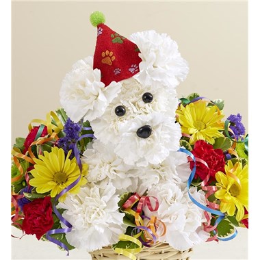 Turning another year older is a lot more fun with our signature birthday a-DOG-able! This party pooch arrives wearing a festive hat, surrounded by a mix of colorful blooms to liven up their celebration. A great gift idea for any age, he’s here to deliver your best wishes in original style.